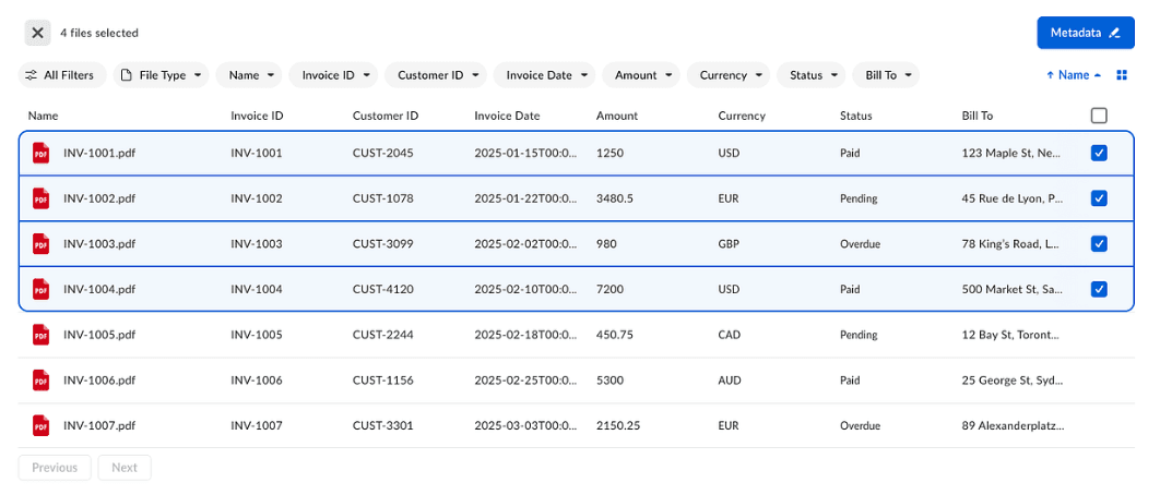 When one or more items are selected, the component header displays the selected count and the Metadata button becomes active. Clicking the Metadata button opens a sidebar that lets users view and edit metadata for the selected items.